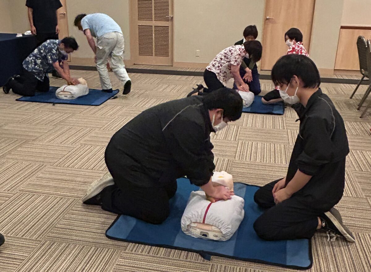 たくさんのお客様がいらっしゃる夏、お客様が少しでも安心してお過ごしいただけるように、マグナリゾートでは毎年夏が始まる前に、救急法基礎講習を実施しています。