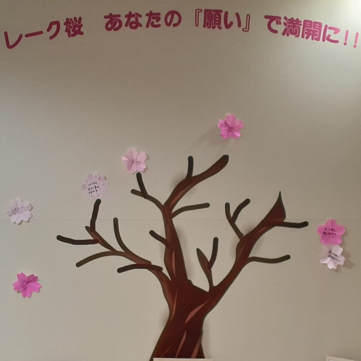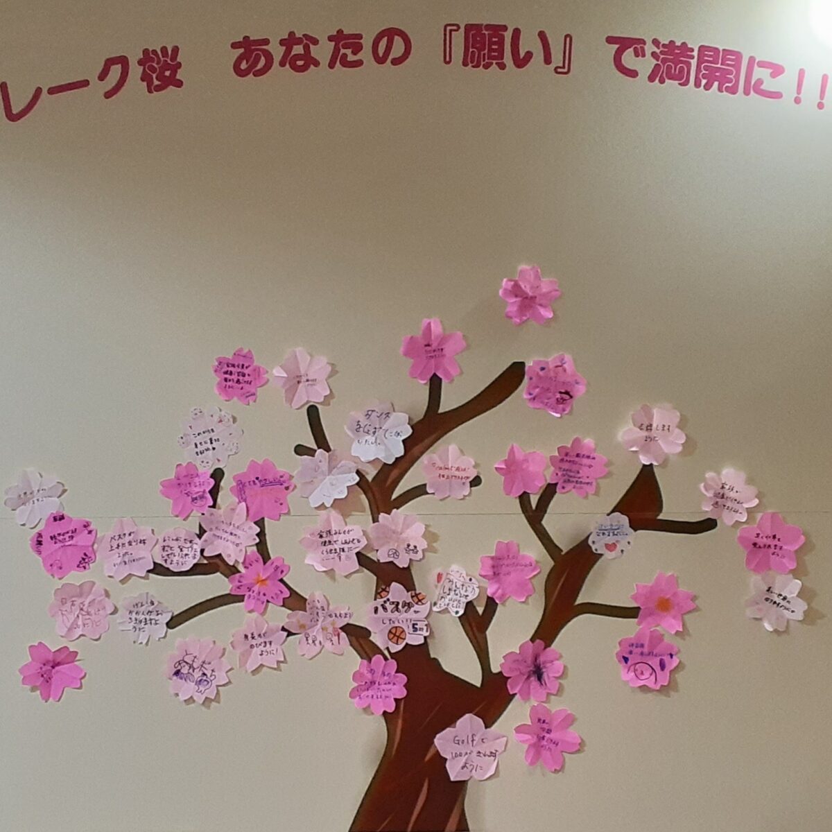 折り紙で桜をつくって、願いごとを書いて貼ると少しずつ桜の木が色づいていきます。