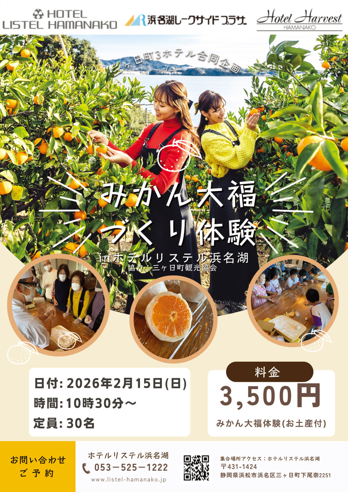 三ヶ日町観光協会様の協力のもと、三ケ日ホテルズ(ホテルリステル浜名湖様、ホテルハーヴェスト浜名湖様、浜名湖レークサイドプラザ)合同で、地域の特産品「みかん」をテーマにした特別体験イベントを開催します。